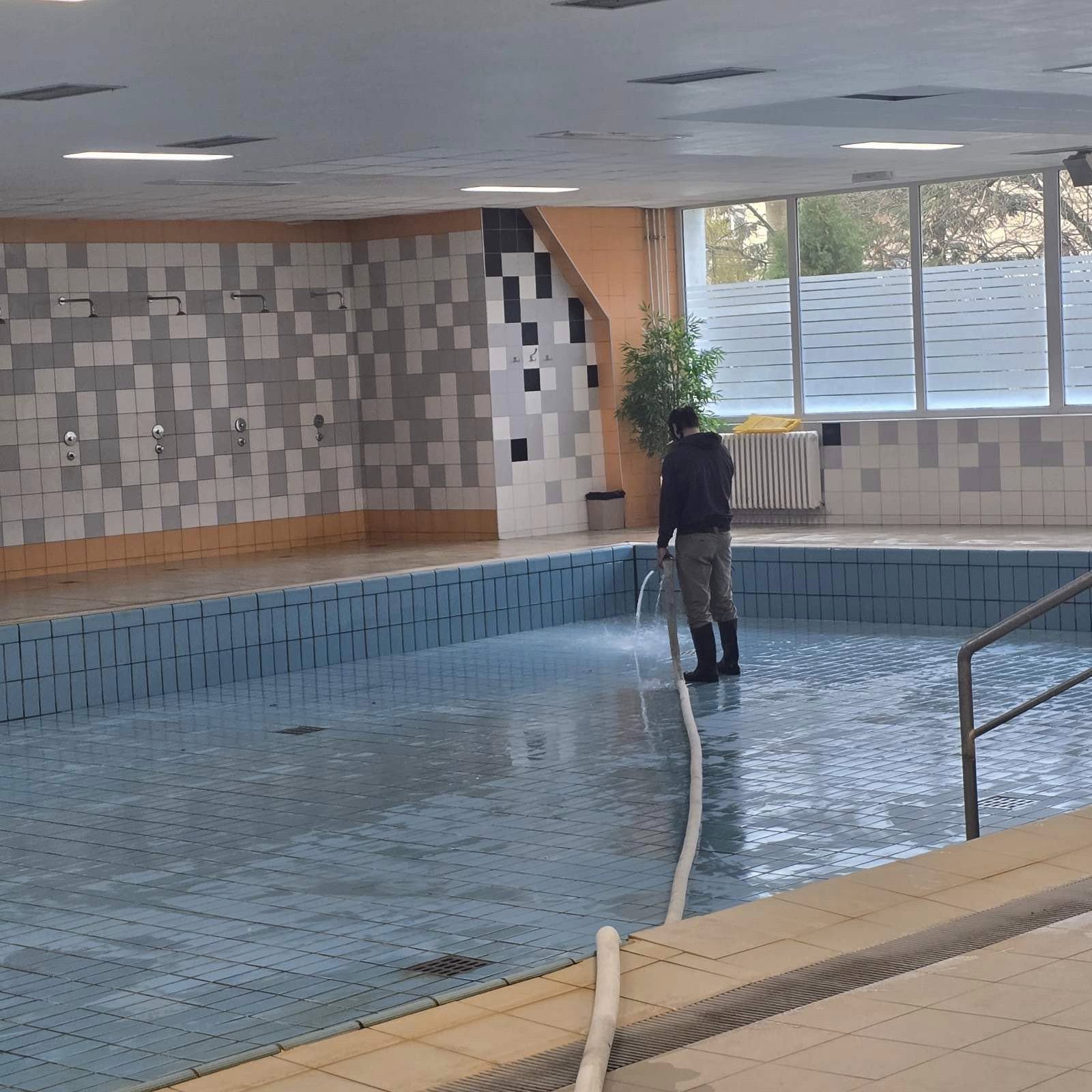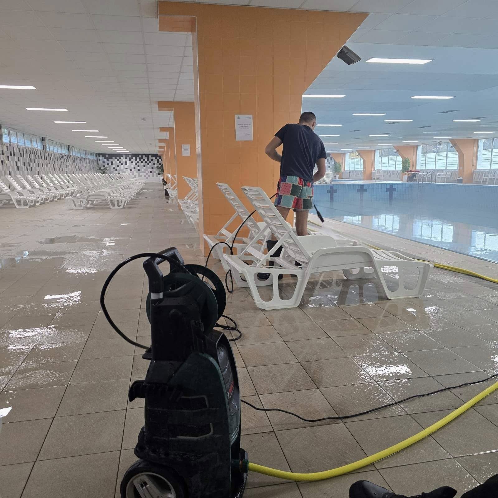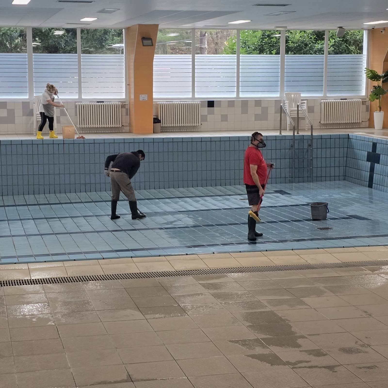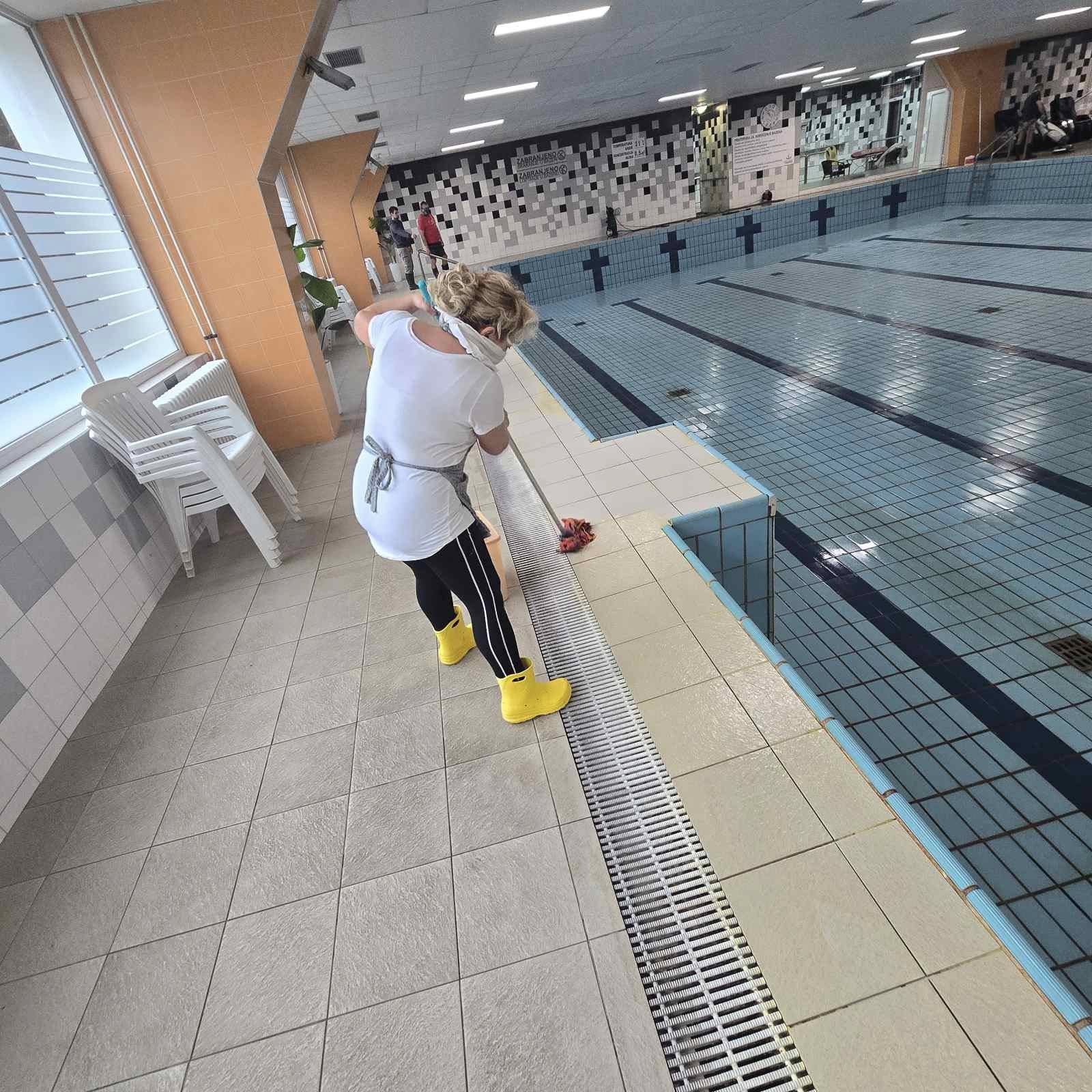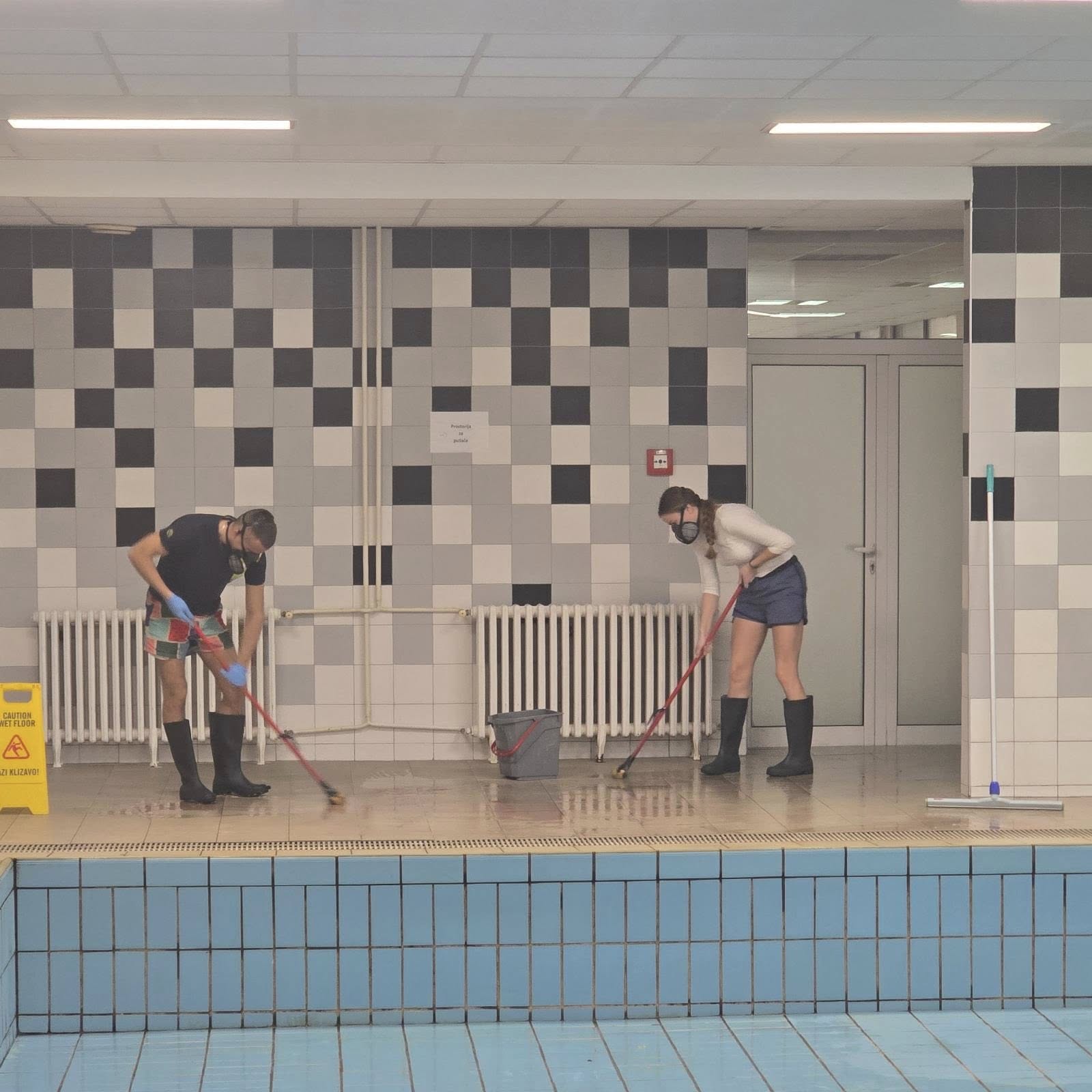 Данас су, током редовног чишћења базена, наше колегинице из сектора хигијене, заједно са спасиоцима на базену, као и сваке прве среде у месецу, обавили детаљно чишћење и прање свих базенских површина.